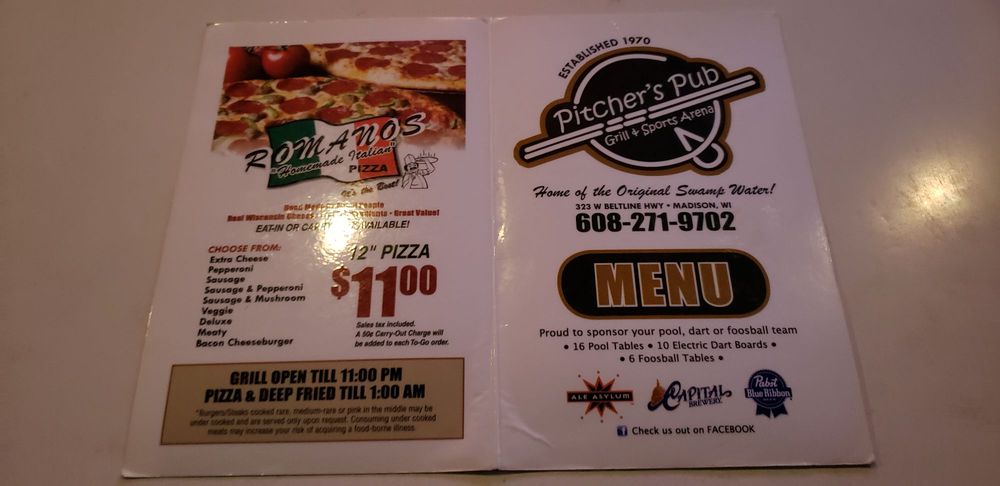 Pitcher's Pub, located in Madison, WI, is a casual American pub known for its welcoming atmosphere and fantastic staff. The pub offers a variety of amenities such as pool tables, gambling machines, TVs, and a long bar with plenty of seating. Customers rave about the signature drink, Swamp Water, which is strong and delicious. The menu features good pub grub and a selection of beers. It's a great spot to hang out with friends, enjoy happy hour specials, and indulge in some classic pub fare. With friendly service, diverse entertainment options, and a cozy vibe, Pitcher's Pub is highly recommended for those looking for a fun and laid-back dining experience.